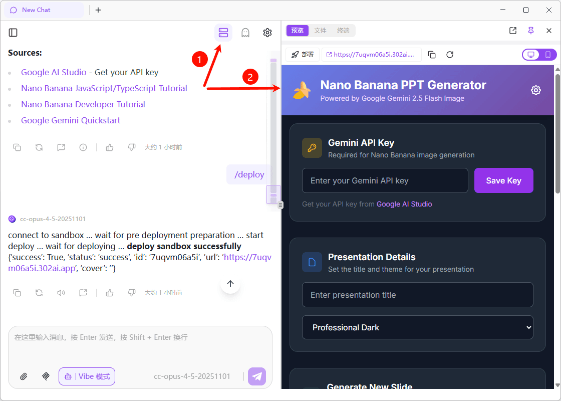 | Description | View application running effects in real-time | Browse and view project file tree structure | View command execution output and running logs |